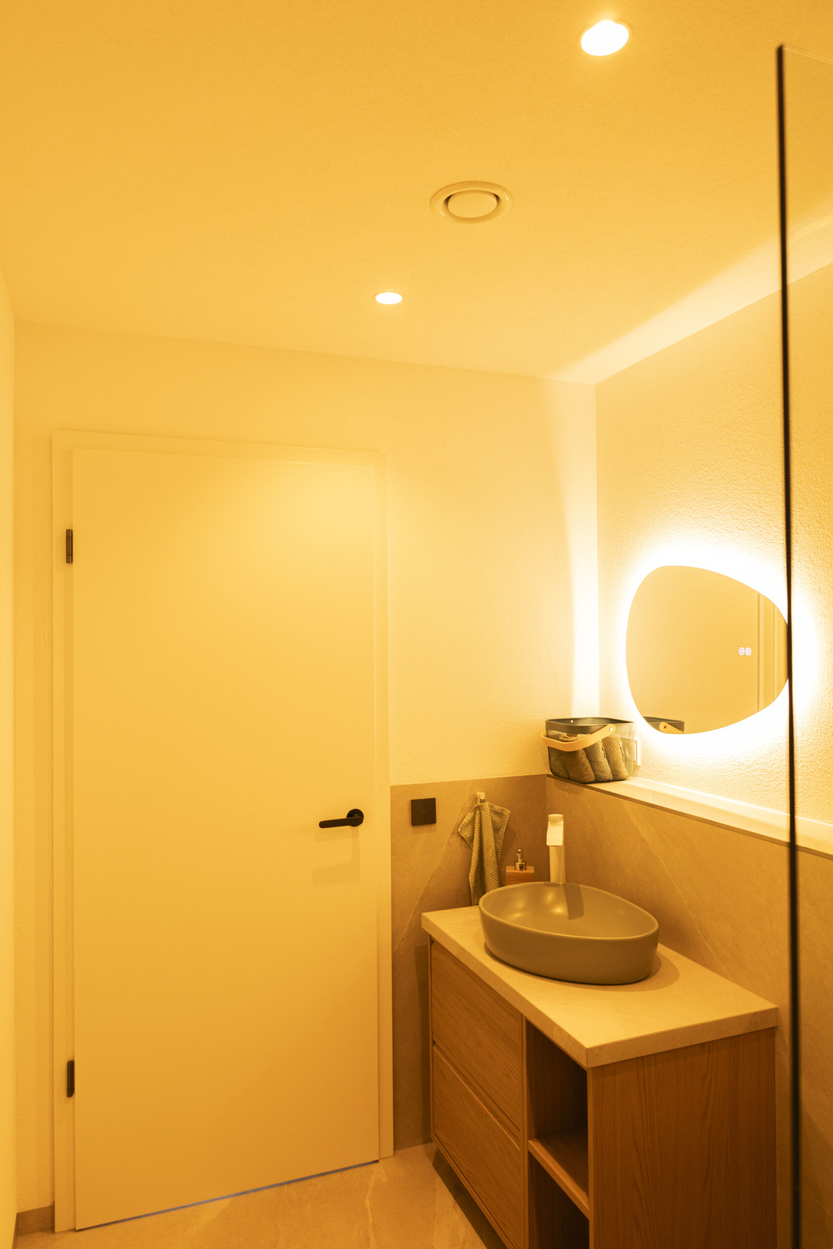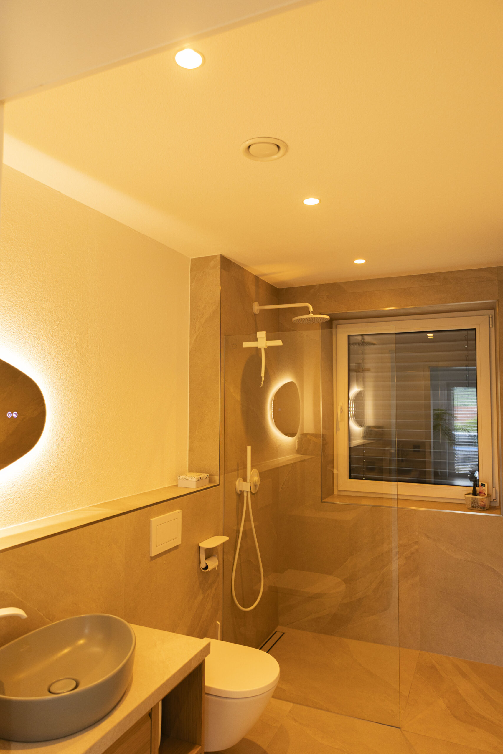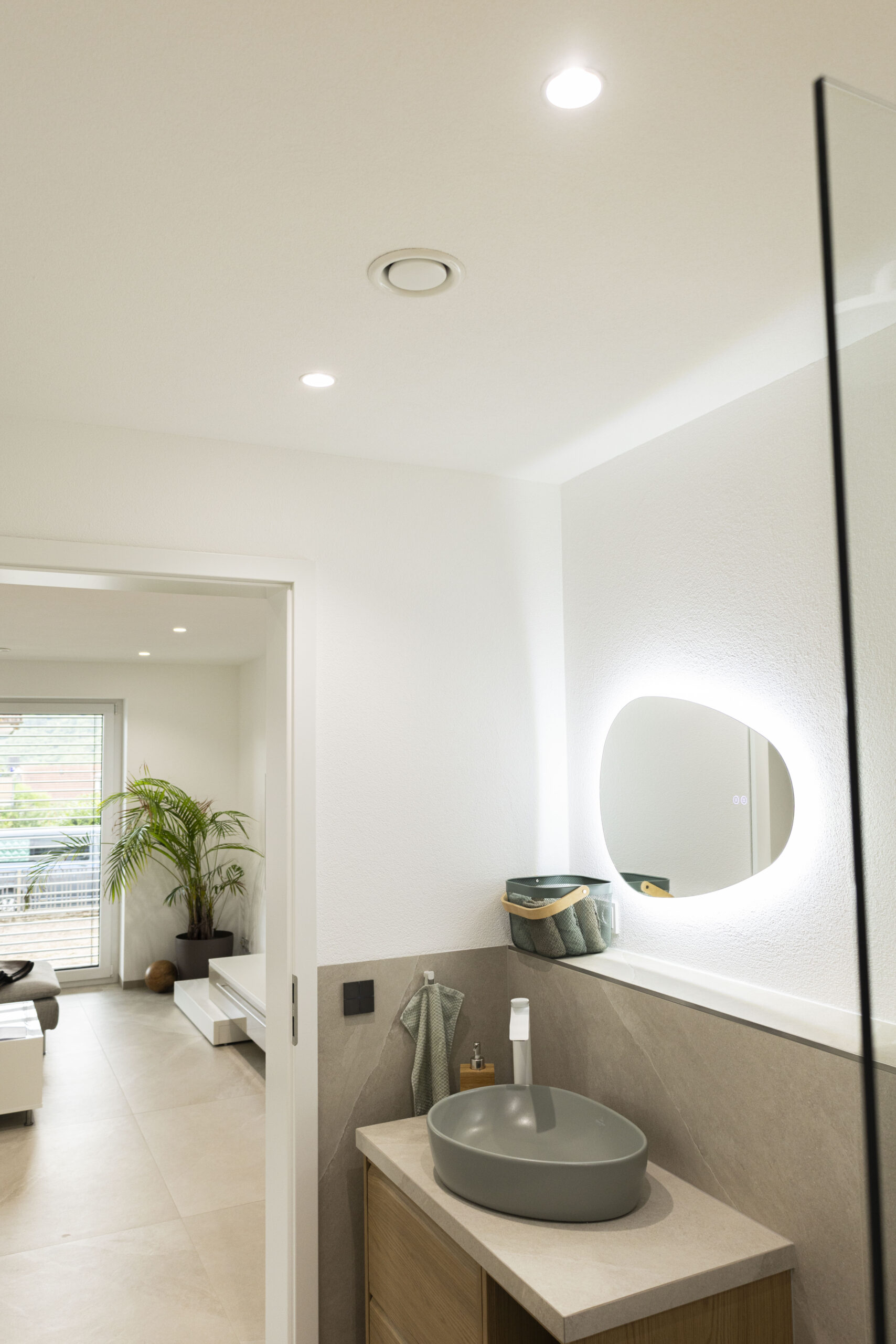 Moderne Badezimmerbeleuchtung mit runden Deckenleuchten und hinterleuchtetem Spiegel – FWZ Elektrotechnik Referenz Villa am Main.