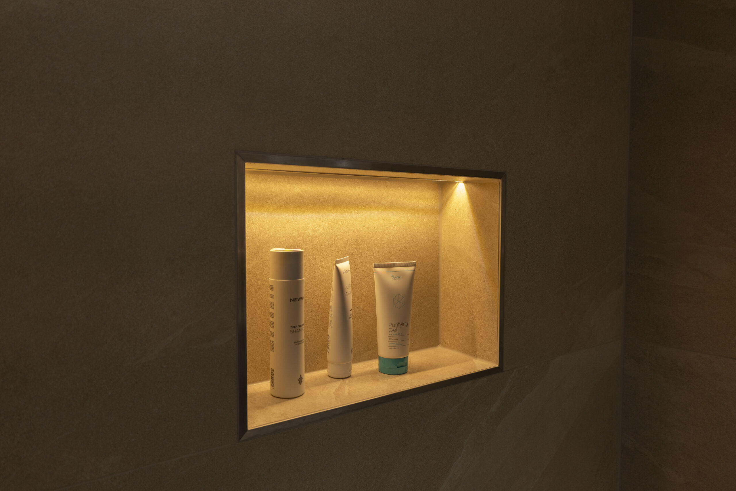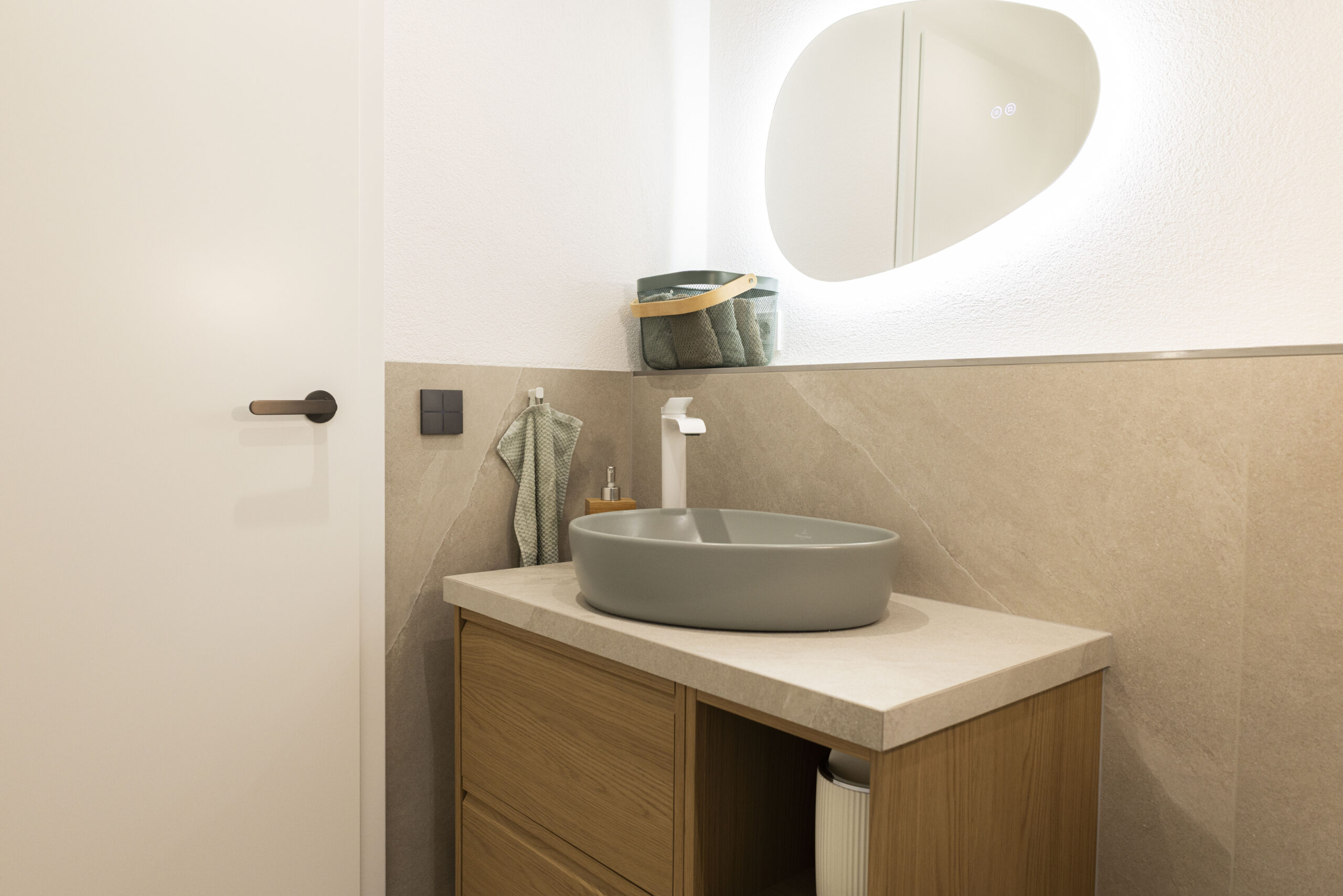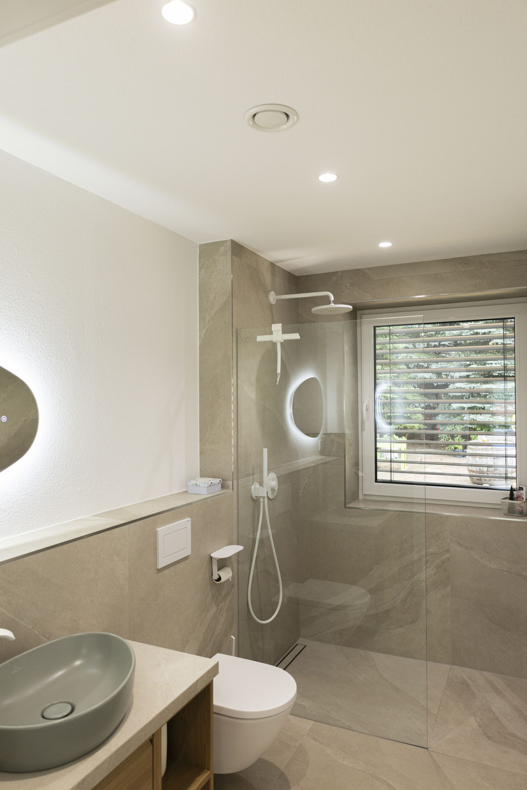 Moderne Badezimmerbeleuchtung mit runden Deckenleuchten und hinterleuchtetem Spiegel – FWZ Elektrotechnik Referenz Villa am Main.