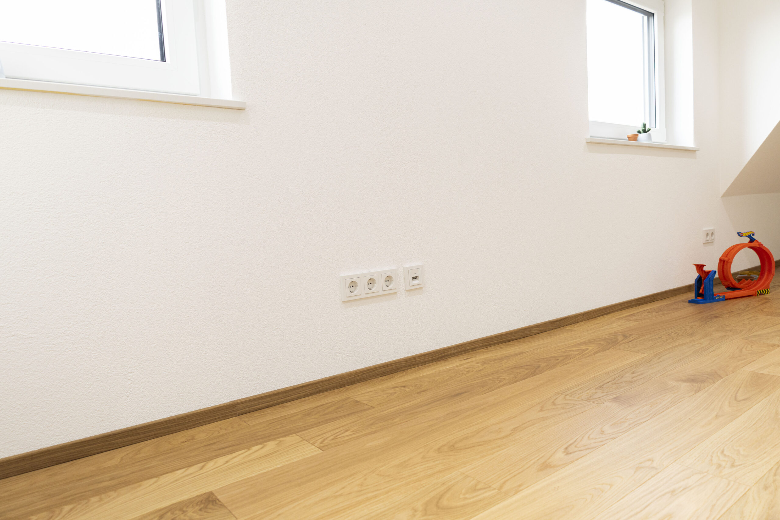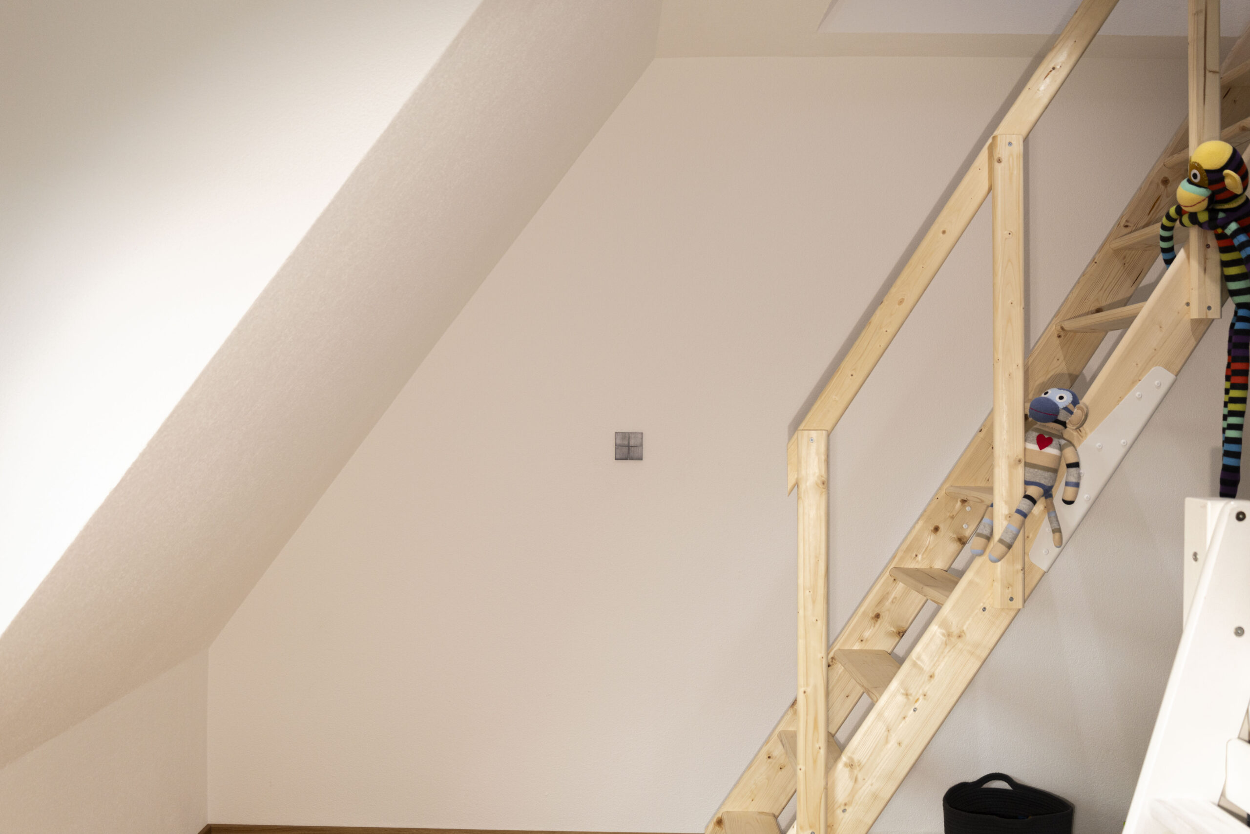 Lineare Beleuchtung in einer Spielhöhle unter der Dachschräge mit blenfreiem Licht entlang der Wand.