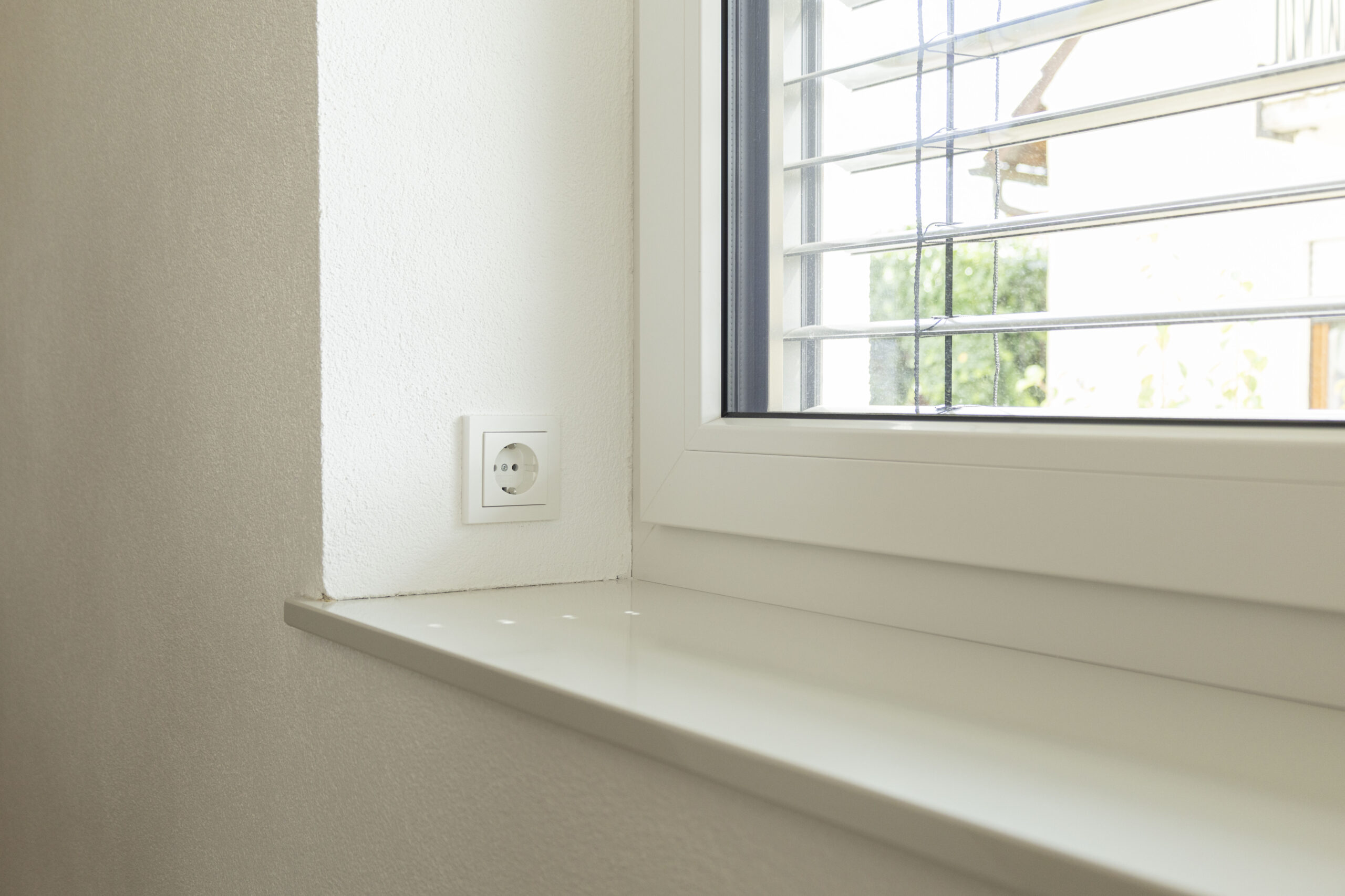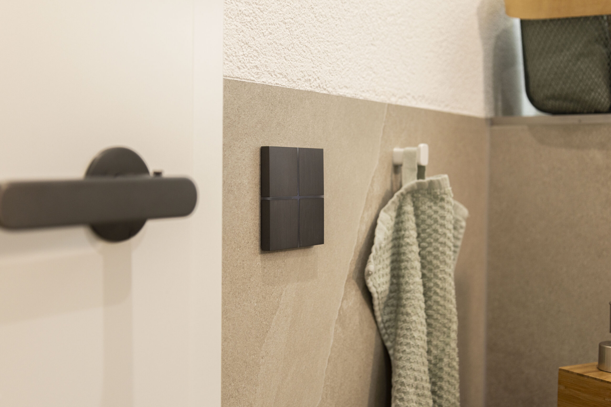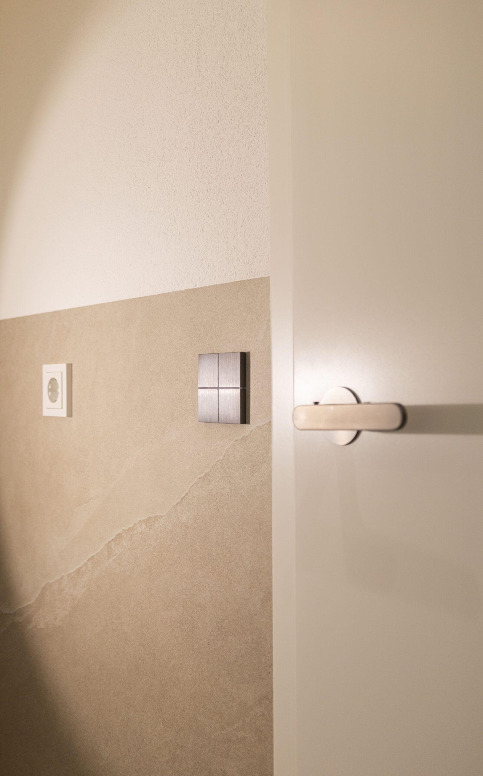Basalte Sentido KNX-Taster aus gebürstetem Metall an weißer Putzwand – FWZ Elektrotechnik Smart Home Referenz.