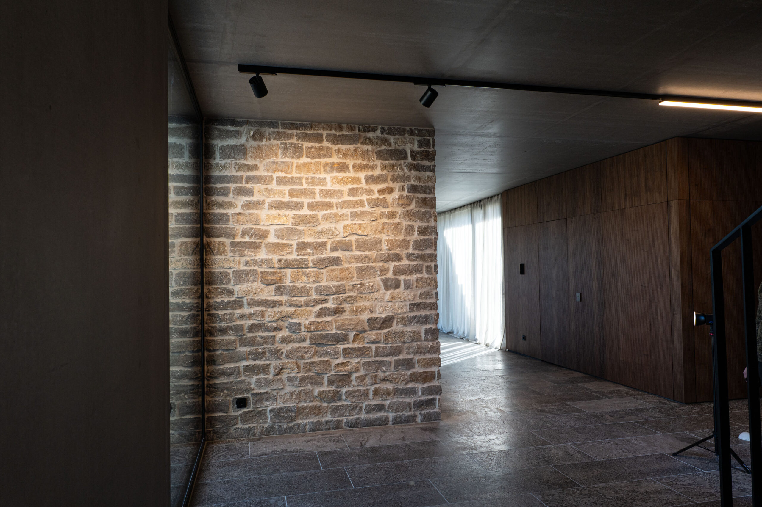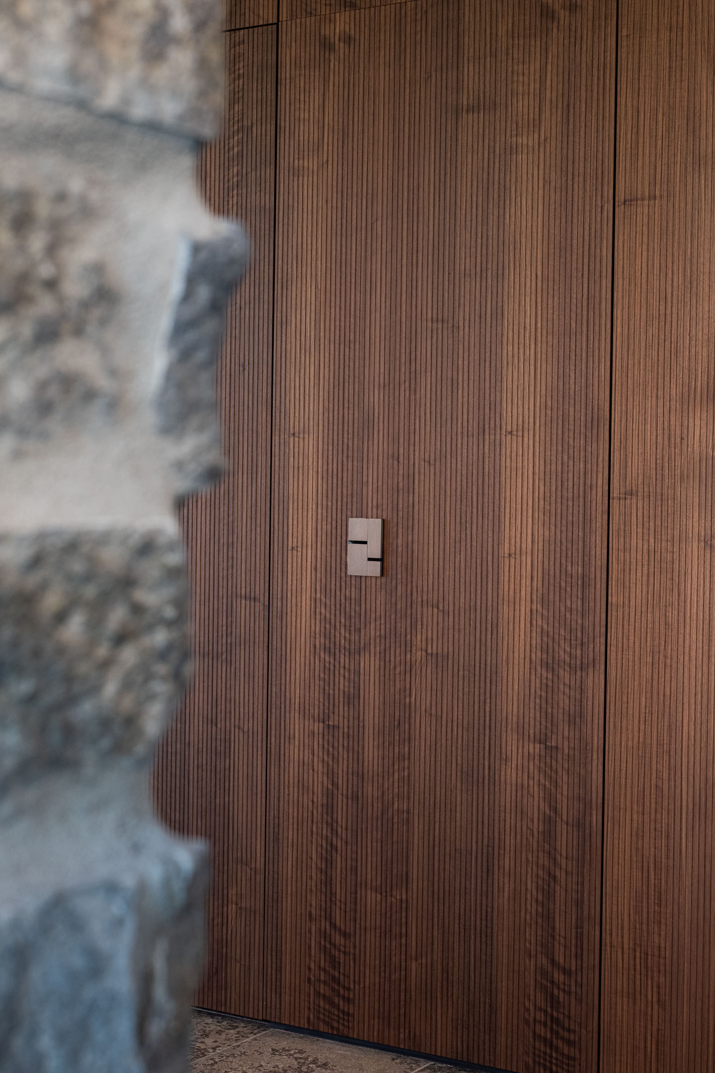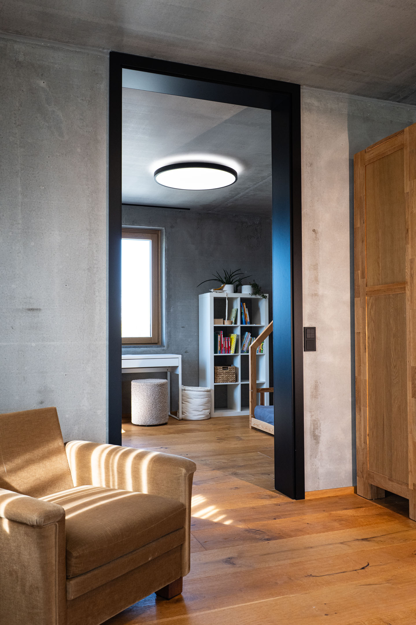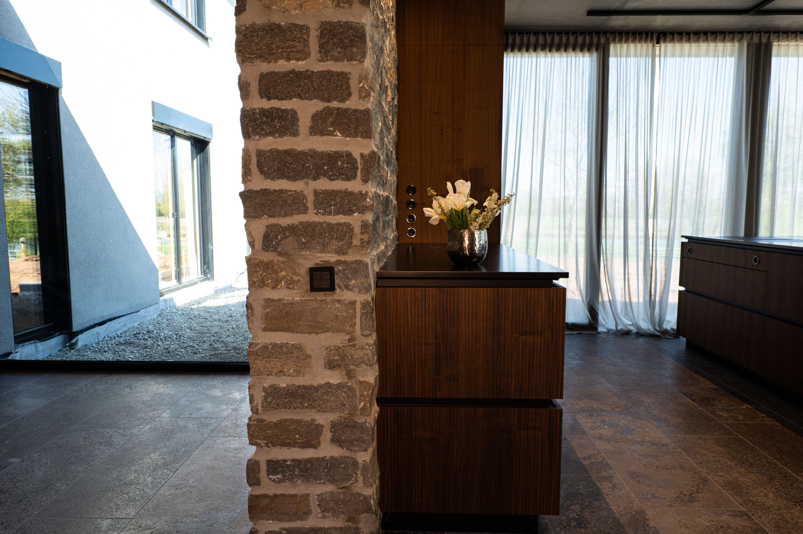 Basalte Fibonacci und Touch-Panel an hochwertiger Holzwand in offenem Wohnkonzept – FWZ Elektrotechnik Referenz Villa am Main.
